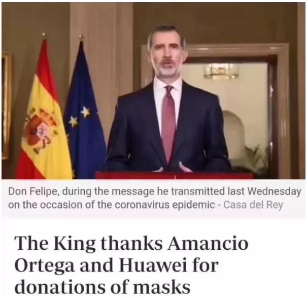 在收到华为捐赠的口罩后,西班牙国王费利佩六世公开表达了谢意,感谢他们在抗击疫情的关键时刻,送上紧缺的医疗物资以支援西班牙。